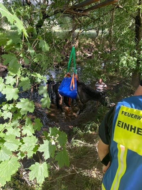 Einsatzbericht Die Feuerwehr Kirkel forderte den Rüstwagen mit dem Tierhebegeschirr an, weil ein Pferd in die Blies gefallen war. Die Kameraden/innen aus Kirkel sicherten zunächst das Tier am Ufer. Die Rettung erfolgte mit dem Tierhebegeschirr und einem Teleskoplader.